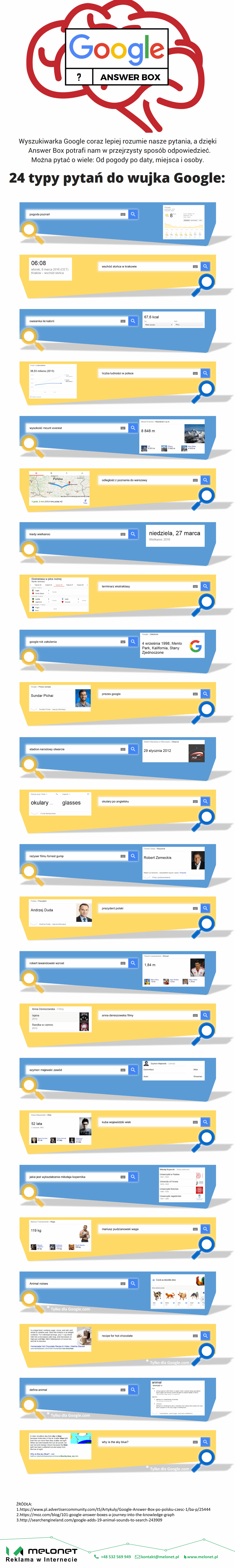 Poniżej możemy poznać możliwości Google Answer Box, czyli 24 przykłady zapytań na które otrzymamy odpowiedź wprost z wyników wyszukiwania bez konieczności przechodzenia do wyświetlonych linków.