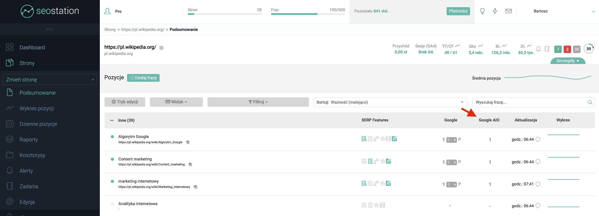 Jako że sekcja z wynikami AI overviews jest nieco odrębnym od wyników stricte organicznych elementem, w SeoStation możecie śledzić pozycje strony osobny w tym elemencie. Na jednym widoku jest więc dostępna kolumna z wynikami organicznymi oraz kolumna Google AIO, w której znajduje się pozycja strony w AI overviews (oczywiście, jeśli w danym dniu monitorowana strona się tam znalazła).