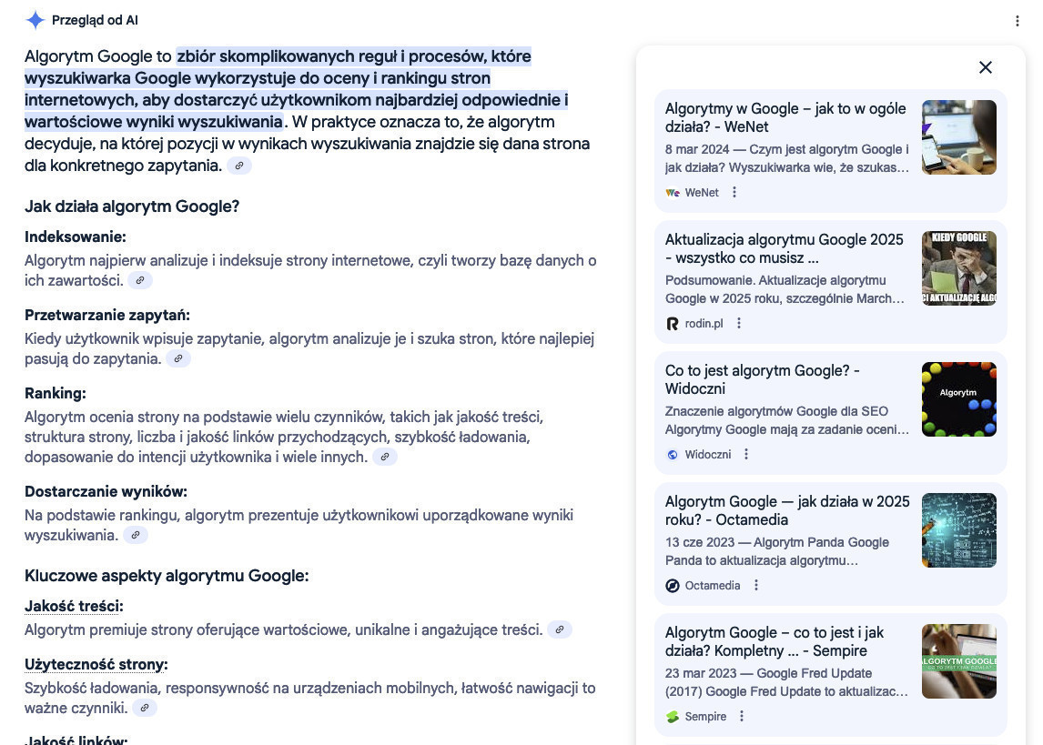 AI Overviews (wcześniej znane jako "SGE" – Search Generative Experience) to nowy rodzaj wyników wyszukiwania, w których Google generuje podsumowanie odpowiedzi przy użyciu sztucznej inteligencji. Pojawiają się one nad tradycyjnymi wynikami organicznymi i zawierają linki do źródeł, z których AI czerpie informacje. AI Overviews są jednym z tzw. SERP Features – specjalnych elementów, które wzbogacają stronę wyników wyszukiwania o dodatkowe treści, takie jak featured snippets, mapki, grafy wiedzy, panele z produktami itp.