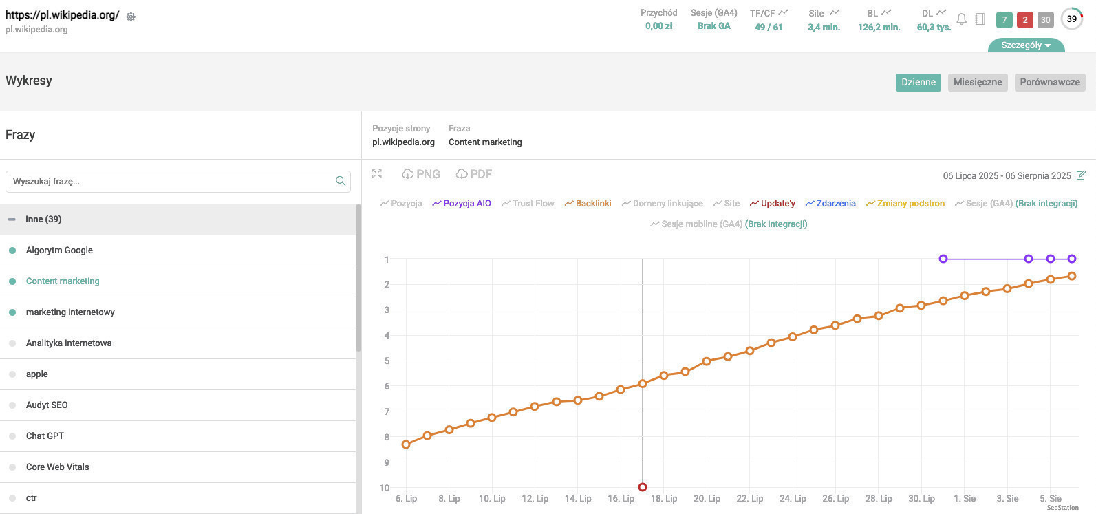 Co więcej, pozycja w AI Overviews jest widoczna również na wykresach pozycji. Dzięki temu możecie śledzić obecność i zmiany pozycji Waszej strony w AIO na przestrzeni czasu – dokładnie tak samo, jak dla standardowych wyników organicznych.