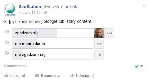 Agato, Piotrze, nasza ankieta miała za zadanie zebrać głosy SEO-wców, którzy na własnej skórze testowali różne rozwiązania. Stąd tak ważne są komentarze zostawione na tablicy wydarzenia - możecie w nich przeczytać różne, czasami skrajne opinie. W sytuacji, w której Google nie ujawnia swoich algorytmów, trudno jednoznaczność - dlatego przy każdym pytaniu umieściliśmy screen, umożliwiający sprawdzenie rozkładu głosów.