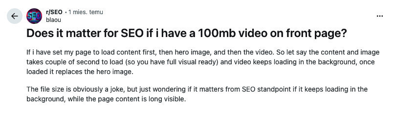 Źródło: http://reddit.com/r/SEO/comments/1p6aph9/does_it_matter_for_seo_if_i_have_a_100mb_video_on/