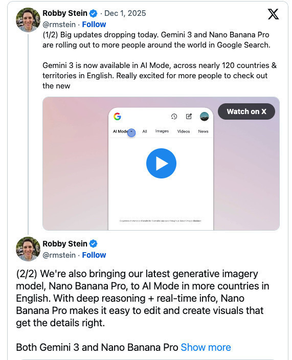 02.12.2025 — Rozszerzenie AI Mode: Gemini 3 oraz „Nano Banana Pro” trafiają do kolejnych krajów. To sygnał, że funkcje generatywne w wyszukiwarce będą dostępne szerzej, a więc rośnie liczba rynków, na których SEO musi brać pod uwagę zmiany w CTR, ekspozycji źródeł i zachowaniach użytkowników w AI Mode. Źródło: https://www.seroundtable.com/google-gemini-3-nano-banana-ai-mode-expand-40529.html