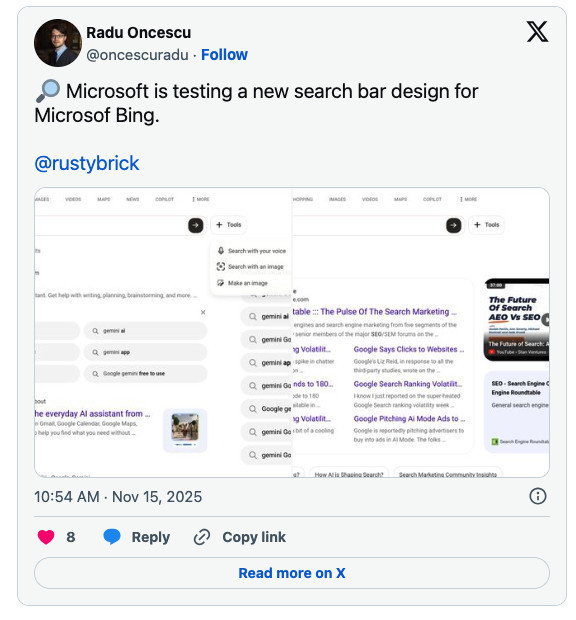 04.12.2025 — Bing testował nowy pasek wyszukiwania z menu „Advanced tools”. Takie zmiany w UI wpływają na to, jak łatwo użytkownicy przełączają filtry/tryby (np. narzędzia, daty, typy wyników) — a to może zmieniać miks zapytań i widoczność niektórych formatów wyników. Źródło: https://www.seroundtable.com/bing-tests-new-search-bar-tools-menu-40444.html