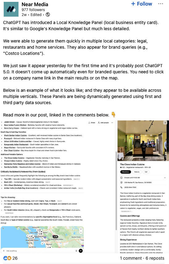 22.12.2025 — ChatGPT zyskał lokalne „knowledge panels” w wynikach. To krok w stronę pełniejszego „answer engine” także w kontekście lokalnym, co może zmieniać zachowania użytkowników (mniej kliknięć do stron, więcej interakcji w panelach) i zwiększać wagę spójnych danych o firmach/miejscach w ekosystemie. Źródło: https://www.seroundtable.com/openai-adds-local-knowledge-panel-to-chatgpt-results-40635.html