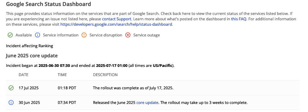 17 lipca 2025 – Google ogłosiło, że wdrażanie update'u dobiegło końca po 16 dniach i 18 godzinach. To druga core update w 2025 r., przy czym jej skalę oceniono jako większą niż marcowej. Choć flagowy proces się domknął, narzędzia monitorujące nadal wskazywały niestabilność.