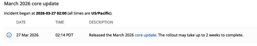 27 marca 2026 – Google rozpoczęło wdrażanie March 2026 Core Update — pierwszej szerokiej aktualizacji algorytmu wyszukiwania od grudniowej aktualizacji 2025 roku. Rollout rozpoczął się o godz. 2:00 AM PT i może trwać nawet dwa tygodnie. Aktualizacja jest opisana jako „regularna aktualizacja mająca na celu lepsze wyświetlanie trafnych i satysfakcjonujących treści". Jeśli chodzi o analitykę i reakcję na update, problem może być nakładanie się dwóch systemów algorytmicznych: egzekwowania polityki spam (zakończone dwa dni wcześniej) i przebudowy sygnałów jakości treści aktywnych niemal jednocześnie.